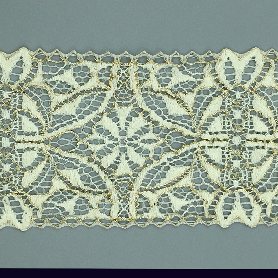 Optez pour ce magnifique galon de dentelle en naturel or avec un motif floral vendu au mètre. Ce galon en dentelle de calais pourra sublimer vos créations grâce à son fil polyester métalo de coloris or qui donne du relief à cette dentelle Leavers.